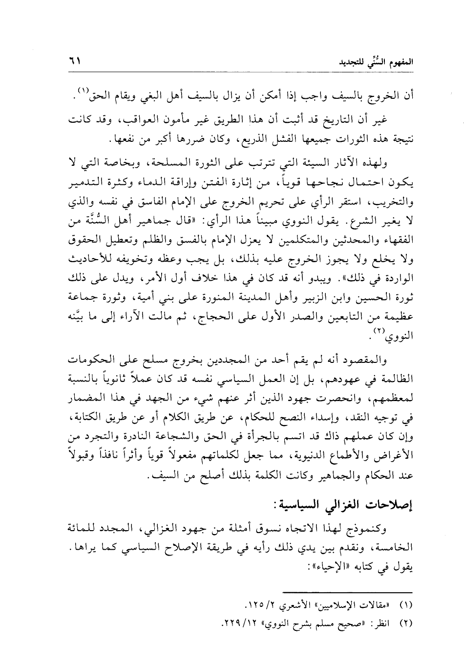 وكنموذج لهذا الاتجاه نسوق أمثلة من جهود الغزالي، المجدد للمائة الخامسة، ونقدم بين يدي ذلك رأيه في طريقة الإصلاح السياسي كما يراها. يقول في كتابه "الإحياء":