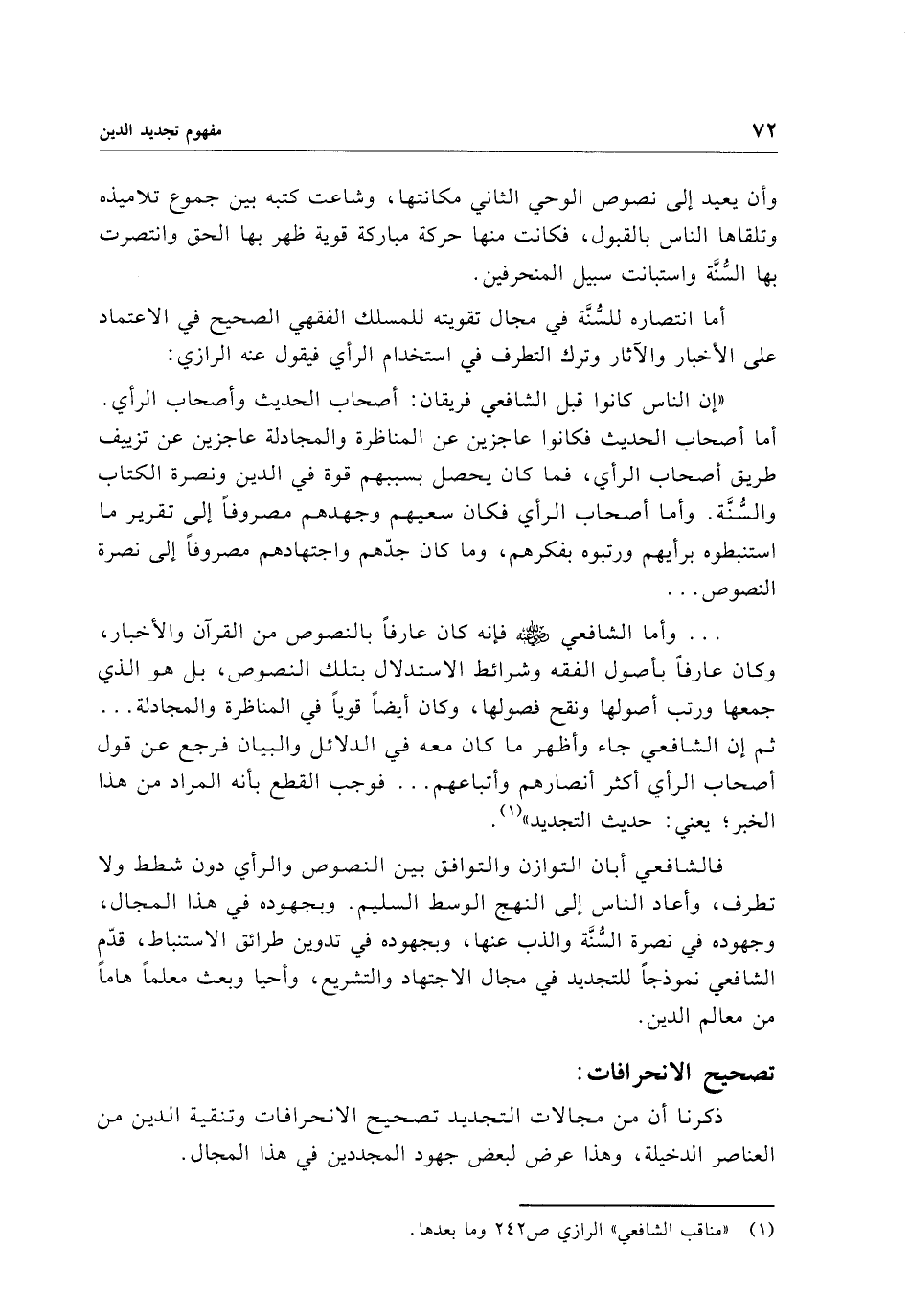 . . . وأما الشافعي - رضي الله عنه - فإنه كان عارفًا بالنصوص من القرآن والأخبار، وكان عارفًا بأصول الفقه وشرائط الاستدلال بتلك النصوص، بل هو الذي جمعها ورتب أصولها ونقح فصولها، وكان أيضًا قويًا في المناظرة والمجادلة. . . ثم إن الشافعي جاء وأظهر ما كان معه في الدلائل والبيان فرجع عن قول أصحاب الرأي أكثر أنصارهم وأتباعهم. . . فوجب القطع بأنه المراد من هذا الخبر؛ يعني: حديث التجديد" (¬1).