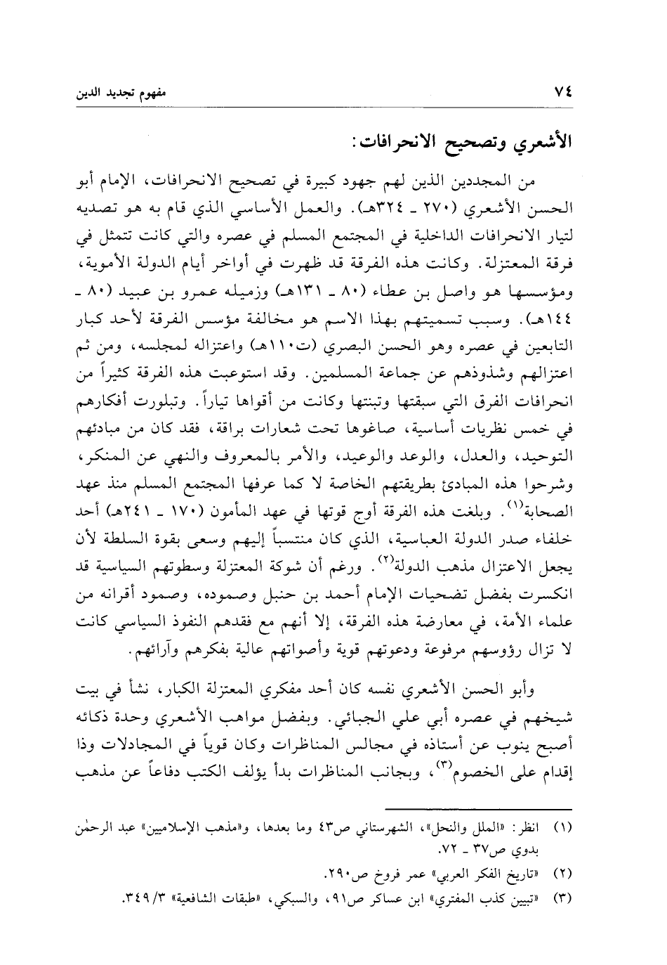 من المجددين الذين لهم جهود كبيرة في تصحيح الانحرافات، الإمام أبو الحسن الأشعري (270 - 324 هـ). والعمل الأساسي الذي قام به هو تصديه لتيار الانحرافات الداخلية في المجتمع المسلم في عصره والتي كانت تتمثل في فرقة المعتزلة. وكانت هذه الفرقة قد ظهرت في أواخر أيام الدولة الأموية، ومؤسسها هو واصل بن عطاء (80 - 131 هـ) وزميله عمرو بن عبيد (80 - 144 هـ). وسبب تسميتهم بهذا الاسم هو مخالفة مؤسس الفرقة لأحد كبار التابعين في عصره وهو الحسن البصري (ت 110 هـ) واعتزاله لمجلسه، ومن ثم اعتزالهم وشذوذهم عن جماعة المسلمين. وقد استوعبت هذه الفرقة كثيرًا من انحرافات الفرق التي سبقتها وتبنتها وكانت من أقواها تيارًا. وتبلورت أفكارهم في خمس نظريات أساسية، صاغوها تحت شعارات براقة، فقد كان من مبادئهم التوحيد، والعدل، والوعد والوعيد، والأمر بالمعروف والنهي عن المنكر، وشرحوا هذه المبادئ بطريقتهم الخاصة لا كما عرفها المجتمع المسلم منذ عهد الصحابة (¬1). وبلغت هذه الفرقة أوج قوتها في عهد المأمون (170 - 241 هـ) أحد خلفاء صدر الدولة العباسية، الذي كان منتسبًا إليهم وسعى بقوة السلطة لأن يجعل الاعتزال مذهب الدولة (¬2). ورغم أن شوكة المعتزلة وسطوتهم السياسية قد انكسرت بفضل تضحيات الإمام أحمد بن حنبل وصموده، وصمود أقرانه من علماء الأمة، في معارضة هذه الفرقة، إلا أنهم مع فقدهم النفوذ السياسي كانت لا تزال رؤوسهم مرفوعة ودعوتهم قوية وأصواتهم عالية بفكرهم وآرائهم.