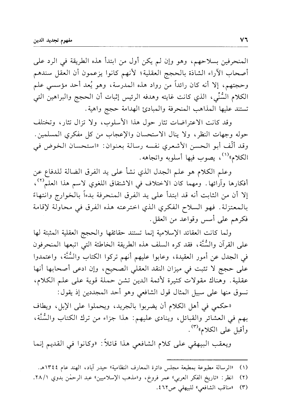 ولما كانت العقائد الإسلامية إنما تستند حقائقها والحجج العقلية المثبتة لها على القرآن والسُّنَّة، فقد كره السلف هذه الطريقة الخاطئة التي اتبعها المنحرفون في الجدل عن أمور العقيدة، وعابوا عليهم أنهم تركوا الكتاب والسُّنَّة، واعتمدوا على حجج لا تثبت في ميزان النقد العقلي الصحيح، وإن ادعى أصحابها أنها عقلية. وهناك مقولات كثيرة لأئمة الدين تشن حملة قوية على علم الكلام، نسوق منها على سبيل المثال قول الشافعي وهو أحد المجددين إذ يقول: