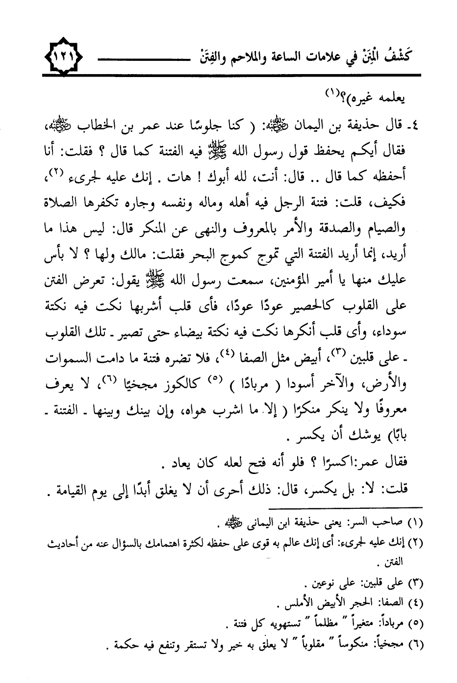4 - قال حذيفة بن اليمان -رضي اللَّه عنه-: (كنا جلوسًا عند عمر بن الخطاب -رضي اللَّه عنه-، فقال أيكم يحفظ قول رسول اللَّه -صلى اللَّه عليه وسلم- فيه الفتنة كما قال؟ فقلت: أنا أحفظه كما قال. . قال: أنت، للَّه أبوك! هات. إنك عليه لجرئ (¬2)، فكيف، قلت. فتنة الرجل فيه أهله وماله ونفسه وجاره تكفرها الصلاة والصيام والصدقة والأمر بالمعروف والنهى عن المنكر قال: ليس هذا ما أريد، إنما أمريد الفتنة التي تموج كموج البحر فقلت: مالك ولها؟ لا بأس عليك منها يا أمير المؤمنين، سمعت رسول اللَّه -صلى اللَّه عليه وسلم- يقول: تعرض الفتن على القلوب كالحصير عودًا عودًا، فأي قلب أشربها نكت فيه نكتة سوداء، وأي قلب أنكرها نكت فيه نكتة بيضاء حتى تصير -تلك القلوب- على قلبين (¬3)، أبيض مثل الصفا (¬4)، فلا تضره فتنة ما دامت السموات والأرض، والآخر أسودا (مربادًا) (¬5) كالكوز مجخيًا (¬6)، لا يعرف معروفًا ولا ينكر منكرًا (إلا ما اشرب هواه، وإن بينك وبينها -الفتنة- بابًا) يوشك أن يكسر.
