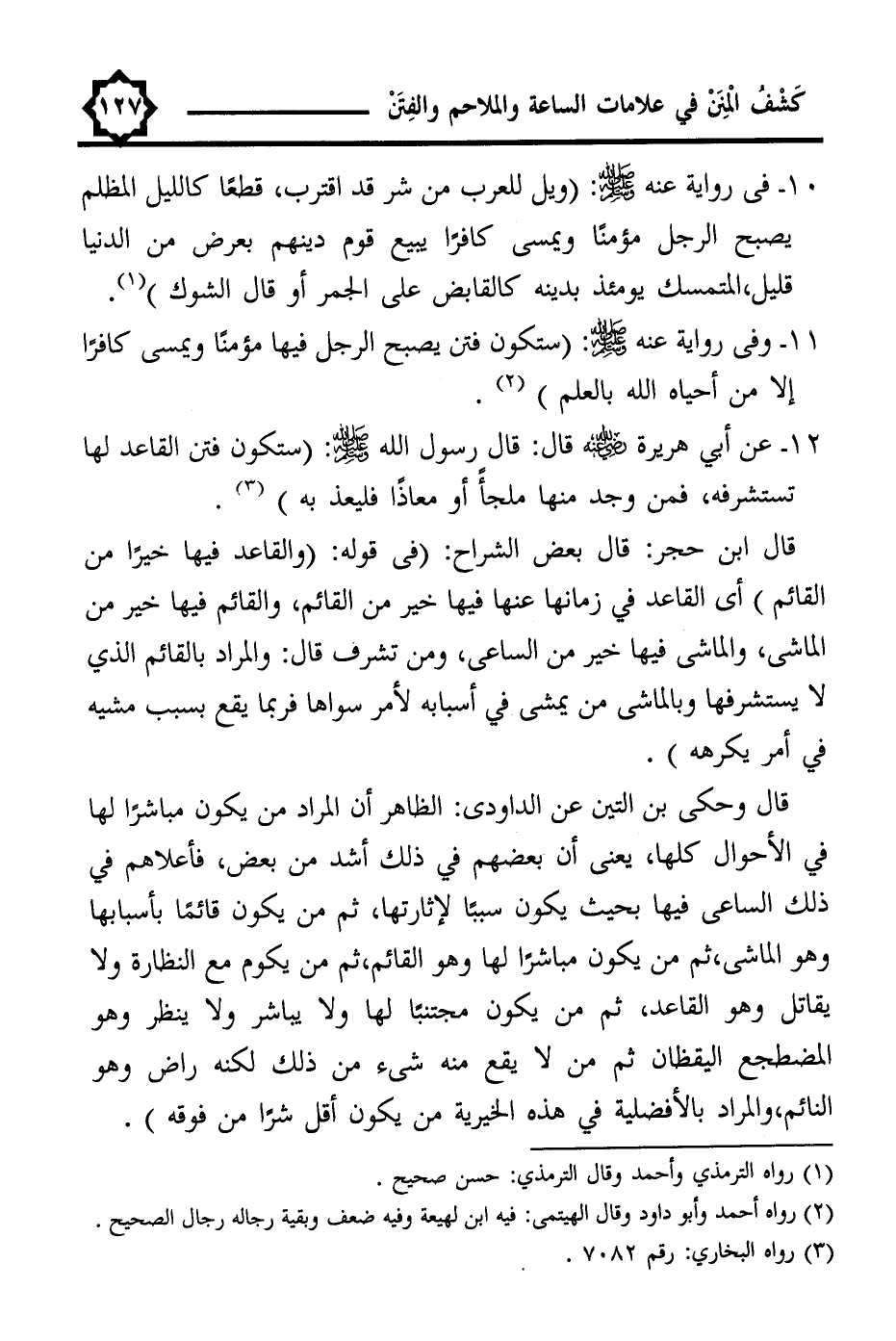 12 - عن أبي هريرة -رضي اللَّه عنه- قال: قال رسول اللَّه -صلى اللَّه عليه وسلم-: (ستكون فتن القاعد لها تستشرقه، فمن وجد منها ملجأً أو معاذًا فليعذ به) (¬3).