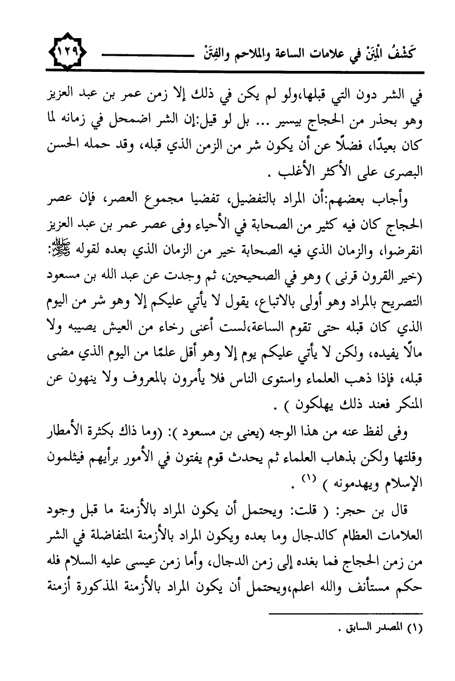 وأجاب بعضهم: أن المراد بالتفضيل، تفضيا مجموع العصر، فإن عصر الحجاج كان فيه كثير من الصحابة في الأحياء وفي عصر عمر بن عبد العزيز انقرضوا، والزمان الذي فيه الصحابة خير من الزمان الذي بعده لقوله -صلى اللَّه عليه وسلم-: (خير القرون قرني) وهو في الصحيحين، ثم وجدت عن عبد اللَّه بن مسعود التصريح بالمراد وهو أولى بالاتباع، يقول لا يأتي عليكم إلا وهو شر من اليوم الذي كان قبله حتى تقوم الساعة، لست أعنى رخاء من العيش يصيبه ولا مالًا يفيده، ولكن لا يأتي عليكم يوم إلا وهو أقل علمًا من اليوم الذي مضى قبله، فإذا ذهب العلماء واستوى الناس فلا يأمرون بالمعروف ولا ينهون عن المنكر فعند ذلك يهلكون).