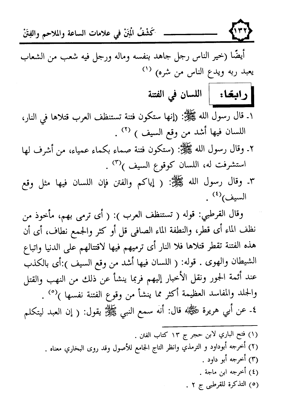 1 - قال رسول اللَّه -صلى اللَّه عليه وسلم-: (إنها ستكون فتنة تستنظف العرب قتلاها في النار، اللسان فيها أشد من وقع السيف) (¬2).