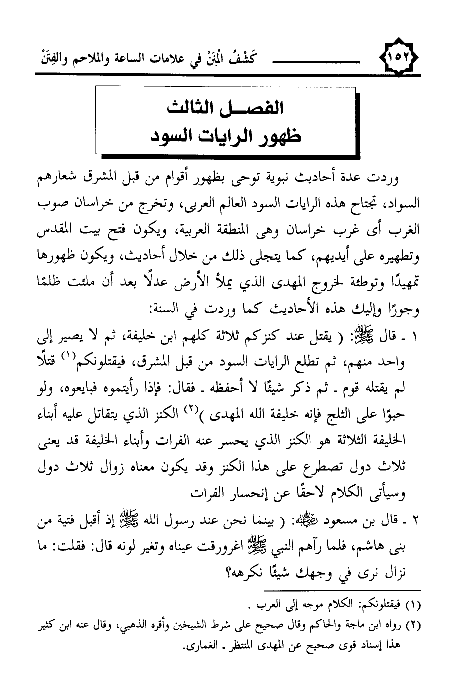 1 - قال -صلى اللَّه عليه وسلم-: (يقتل عند كنزكم ثلاثة كلهم ابن خليفة، ثم لا يصير إلى واحد منهم، ثم تطلع الرايات السود من قبل المشرق، فيقتلونكم (¬1) قتلًا لم يقتله قوم -ثم ذكر شيئًا لا أحفظه- فقال: فإذا رأيتموه فبايعوه، ولو حبوًا على الثلج فإنه خليفة اللَّه المهدى) (¬2) الكنز الذي يتقاتل عليه أبناء الخليفة الثلاثة هو الكنز الذي يحسر عنه الفرات وأبناء الخليفة قد يعنى ثلاث دول تصطرع على هذا الكنز وقد يكون معناه زوال ثلاث دول وسيأتى الكلام لاحقًا عن إنحسار الفرات