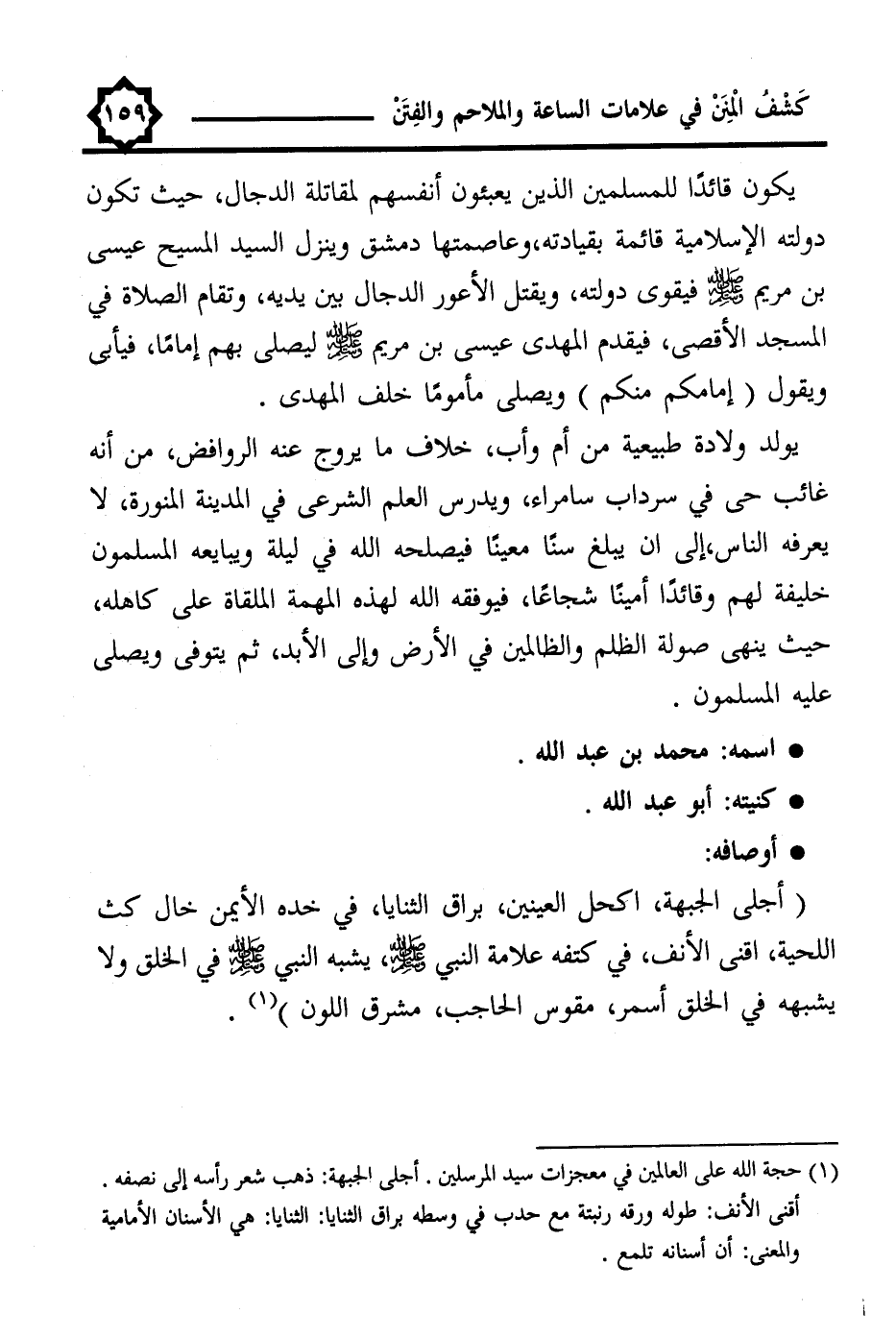 (¬1) حجة اللَّه على العالمين في معجزات سيد المرسلين. أجلى الجبهة: ذهب شعر رأسه إلى نصفه. أقنى الأنف: طوله ورقه رنبتة مع حدب في وسطه براق الثنايا: الثنايا: هي الأسنان الأمامية والمعنى: أن أسنانه تلمع.
