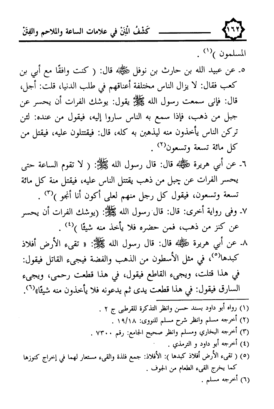 6 - عن أبي هريرة -رضي اللَّه عنه- قال: قال رسول اللَّه -صلى اللَّه عليه وسلم- (لا تقوم الساعة حتى يحسر الفرات عن جبل من ذهب يقتتل الناس عليه، فيقتل منة كل مائة تسعة وتسعون، فيقول كل رجل منهم لعلى أكون أنا أنجو) (¬3).