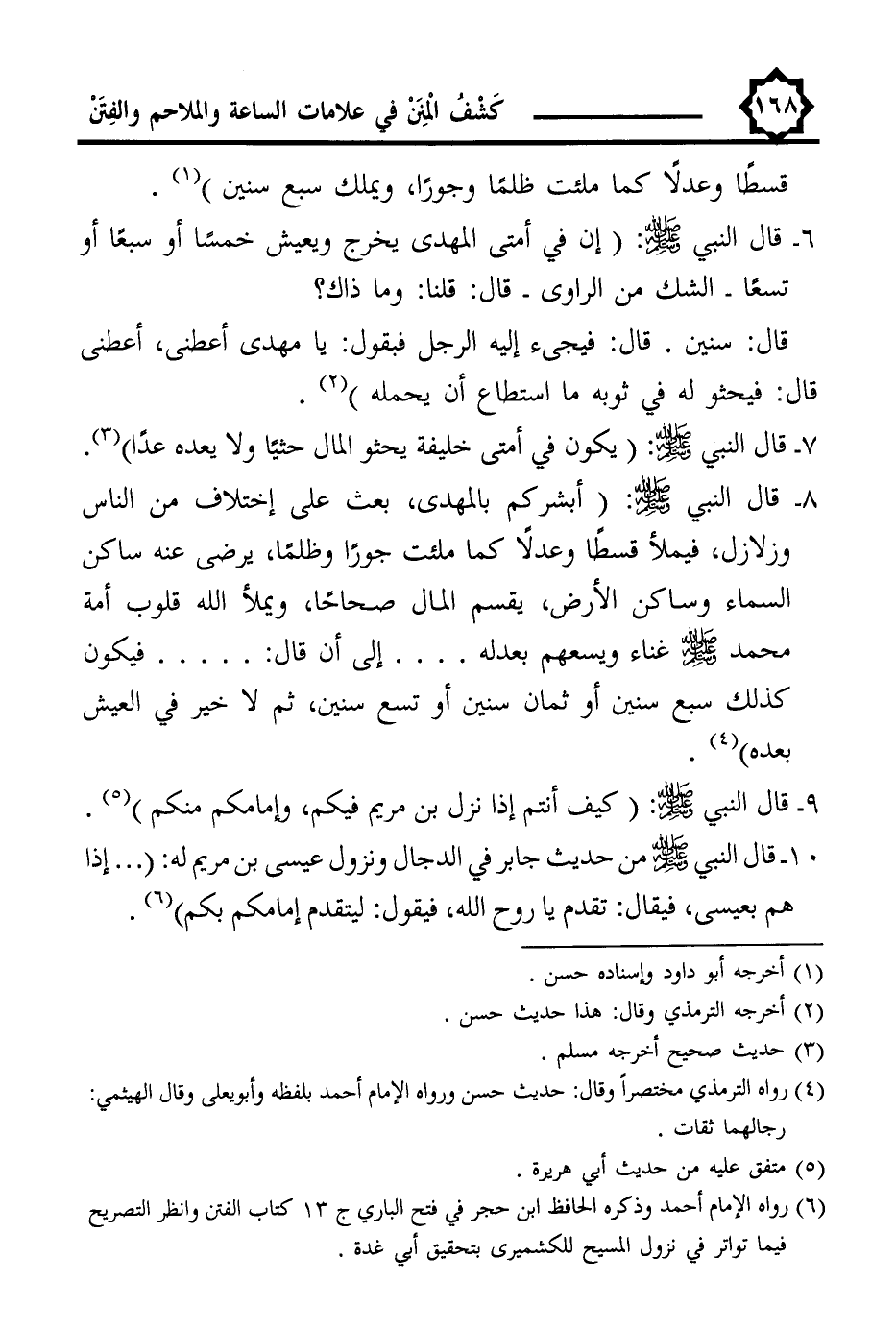 (¬6) رواه الإمام أحمد وذكره الحافظ ابن حجر في فتح الباري ج 13 كتاب الفتن وانظر التصريح فيما تواتر في نزول المسيح للكشميرى بتحقيق أبي غدة.