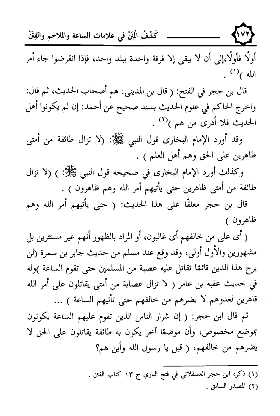 وكذلك أورد الإمام البخارى في صحيحه قول النبي -صلى اللَّه عليه وسلم-:) (لا تزال طائفة من أمتى ظاهرين حتى يأتيهم أمر اللَّه وهم ظاهرون).