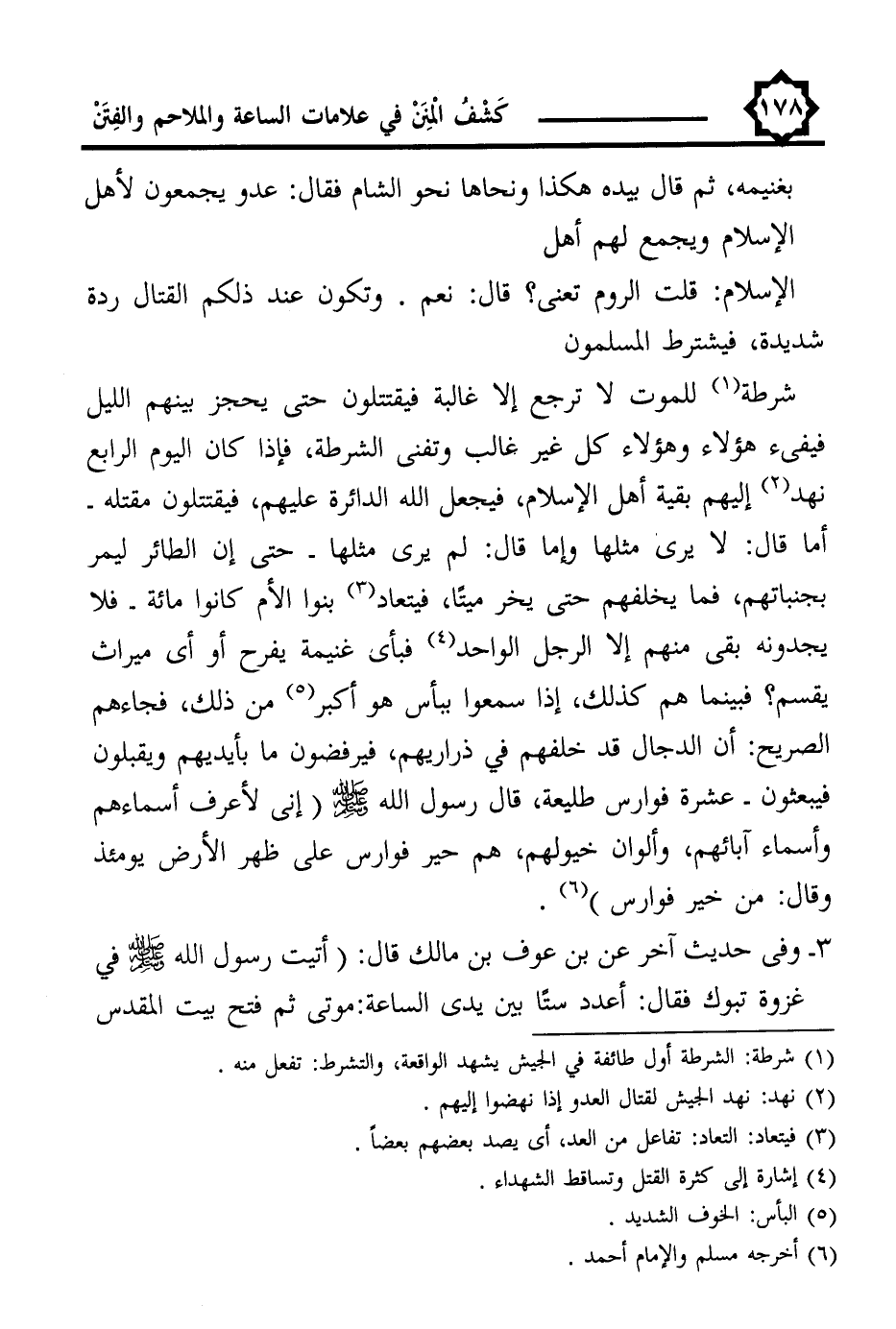 3 - وفى حديث آخر عن بن عوف بن مالك قال: (أتيت رسول اللَّه -صلى اللَّه عليه وسلم- في غزوة تبوك فقال: أعدد ستًا بين يدى الساعة: موتى ثم فتح بيت المقدس
