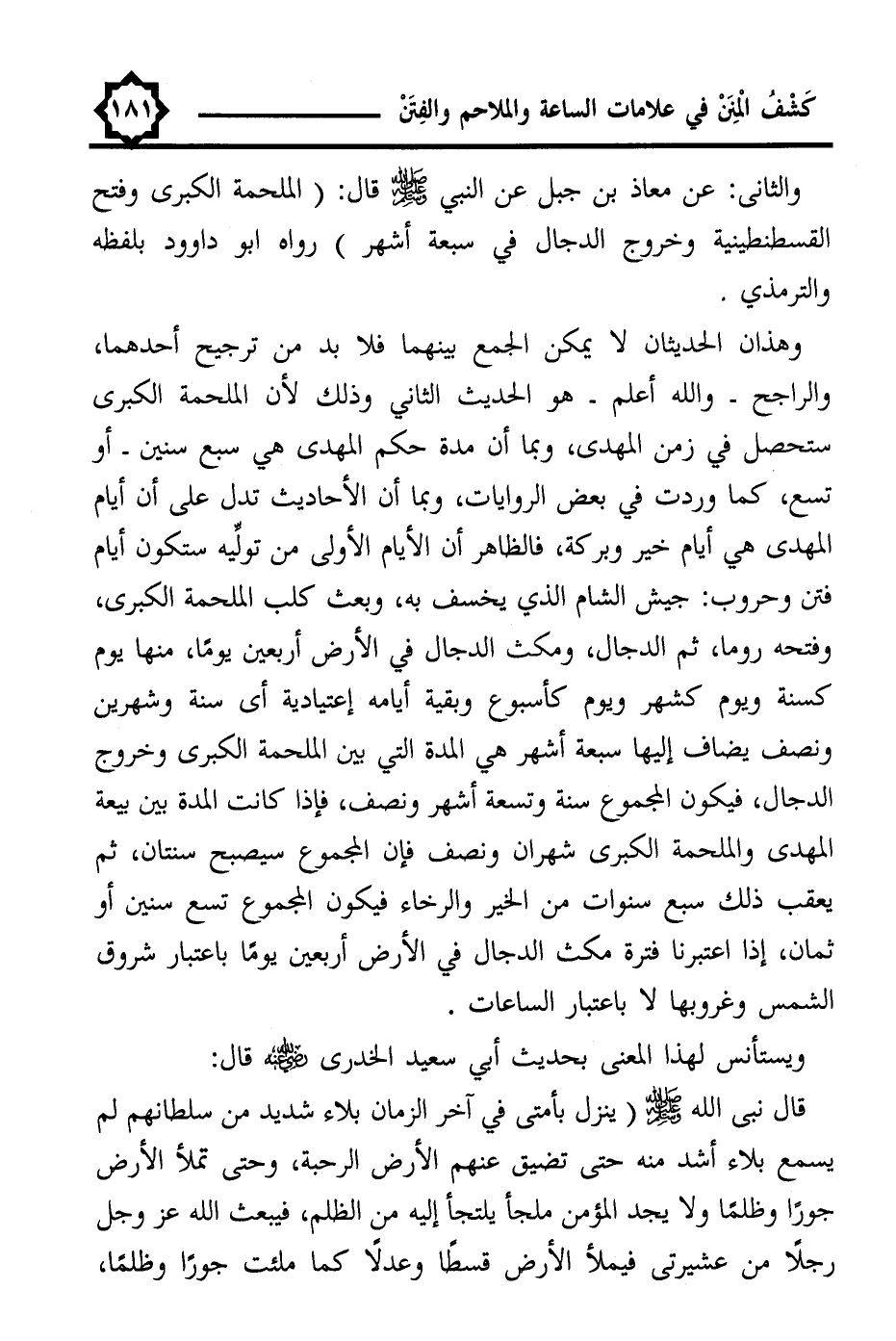 وهذان الحديثان لا يمكن الجمع بينهما فلا بد من ترجيح أحدهما، والراجح -واللَّه أعلم- هو الحديث الثاني وذلك لأن الملحمة الكبرى ستحصل في زمن المهدى، وبما أن مدة حكم المهدى هي سبع سنين -أو تسع، كما وردت في بعض الروايات، وبما أن الأحاديث تدل على أن أيام المهدى هي أيام خير وبركة، فالظاهر أن الأيام الأولى من تولِّيه ستكون أيام فتن وحروب: جيش الشام الذي يخسف به، وبعث كلب الملحمة الكبرى، وفتحه روما، ثم الدجال، ومكث الدجال في الأرض أربعين يومًا، منها يوم كسنة ويوم كشهر ويوم كأسبوع وبقية أيامه إعتيادية أي سنة وشهرين ونصف يضاف إليها سبعة أشهر هي المدة التي بين الملحمة الكبرى وخروج الدجال، فيكون المجموع سنة وتسعة أشهر ونصف، فإذا كانت المدة بين بيعة المهدى والملحمة الكبرى شهران ونصف فإن المجموع سيصبح سنتان، ثم يعقب ذلك سبع سنوات من الخير والرخاء فيكون المجموع تسع سنين أو ثمان، إذا اعتبرنا فترة مكث الدجال في الأرض أربعين يومًا باعتبار شروق الشمس وغروبها لا باعتبار الساعات.