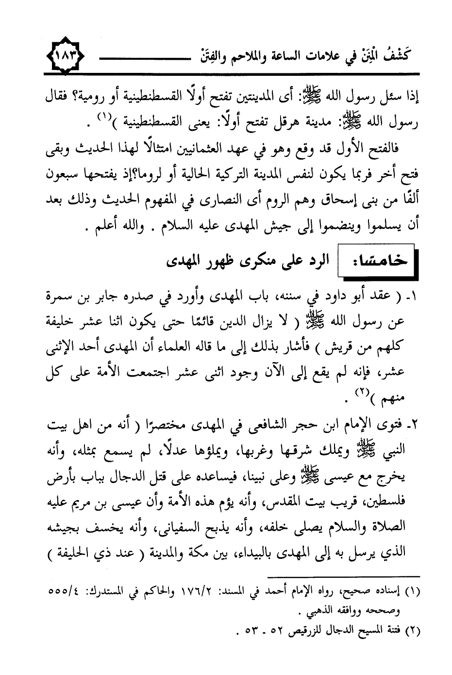 2 - فتوى الإمام ابن حجر الشافعى في المهدى مختصرًا (أنه من أهل بيت النبي -صلى اللَّه عليه وسلم- ويملك شرقها وغربها، ويملؤها عدلًا، لم يسمع بمثله، وأنه يخرج مع عيسى -صلى اللَّه عليه وسلم- وعلى نبينا، فيساعده على قتل الدجال بباب بأرض فلسطين، قريب بيت المقدس، وأنه يؤم هذه الأمة وأن عيسى بن مريم عليه الصلاة والسلام يصلى خلفه، وأنه يذبح السفيانى، وأنه يخسف بجيشه الذي يرسل به إلى المهدى بالبيداء، بين مكة والمدينة (عند ذي الحليفة)