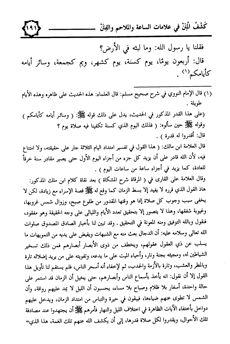 (¬1) قال الإمام النووي في شرح صحيح مسلم: قال العلماء: هذه الحديث على ظاهره وهذه الأيام طويلة.