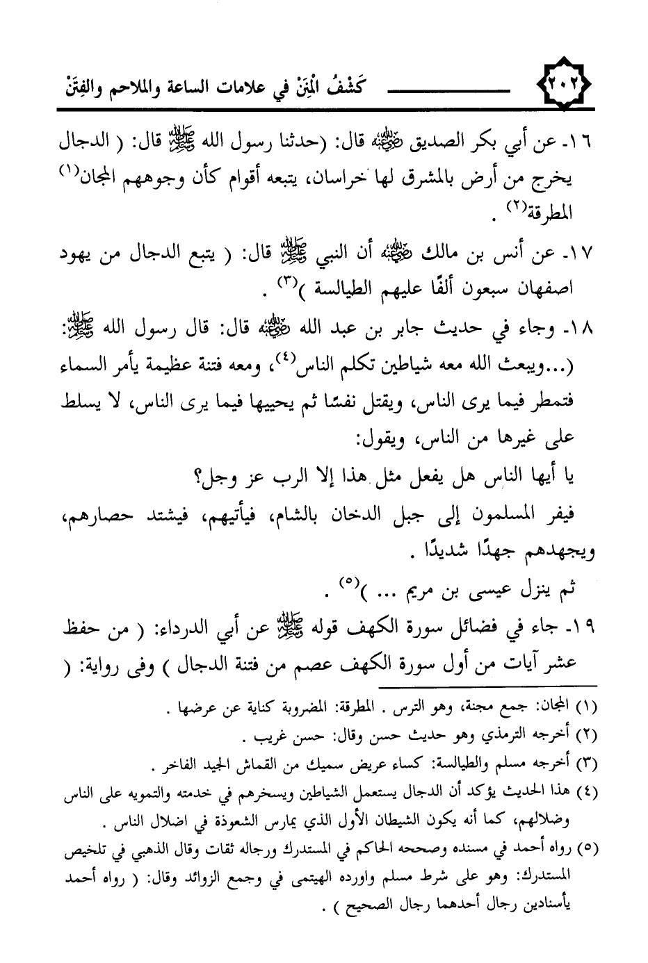 16 - عن أبي بكر الصديق -رضي اللَّه عنه- قال: (حدثنا رسول اللَّه -صلى اللَّه عليه وسلم- قال: (الدجال يخرج من أرض بالمشرق لها خراسان، يتبعه أقوام كأن وجوههم المجان (¬1) المطرقة (¬2).