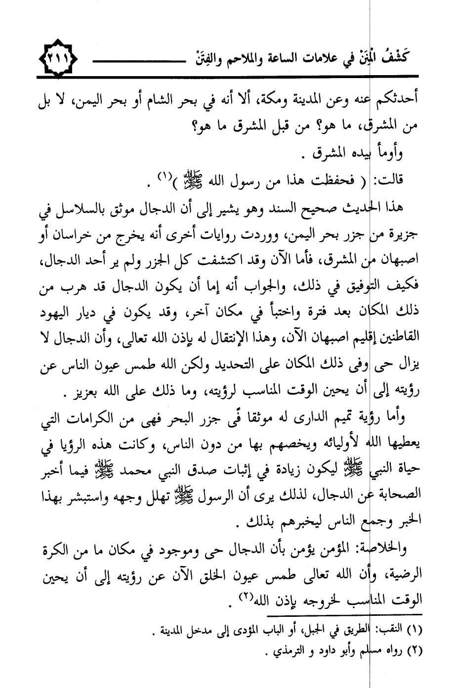 هذا الحديث صحيح السند وهو يشير إلى أن الدجال موثق بالسلاسل في جزيرة من جزر بحر اليمن، ووردت روايات أخرى أنه يخرج من خراسان أو أصبهان من المشرق، فأما الآن وقد اكتشفت كل الجزر ولم ير أحد الدجال، فكيف التوفيق في ذلك، والجواب أنه إما أن يكون الدجال قد هرب من ذلك المكان بعد فترة واختبأ في مكان آخر، وقد يكون في ديار اليهود القاطنين إقليم اصبهان الآن، وهذا الإنتقال له بإذن اللَّه تعالى، وأن الدجال لا يزال حى وفى ذلك المكان على التحديد ولكن اللَّه طمس عيون الناس عن رؤيته إلى أن يحين الوقت المناسب لرؤيته، وما ذلك على اللَّه بعزيز.