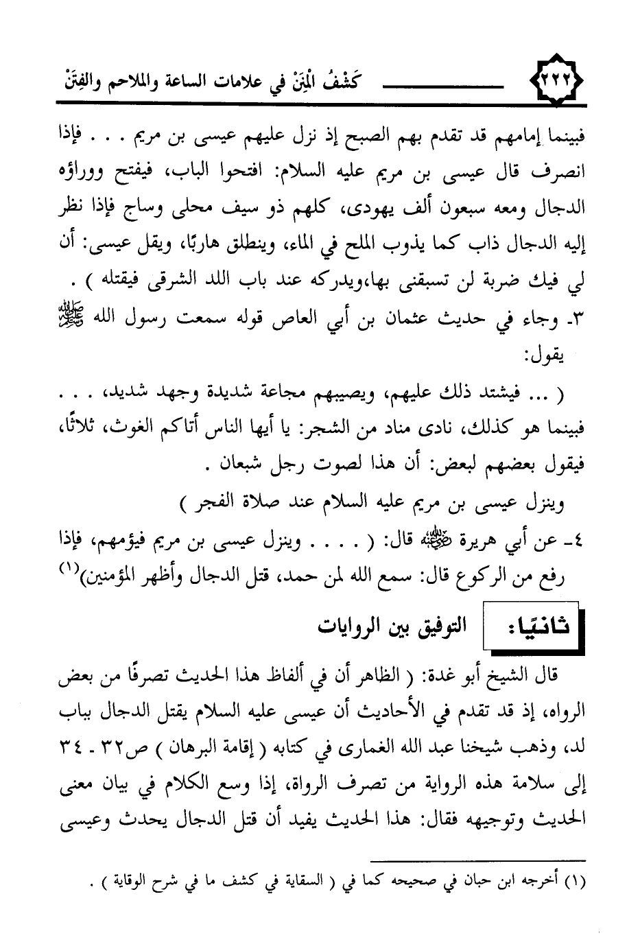 قال الشيخ أبو غدة: (الظاهر أن في ألفاظ هذا الحديث تصرفًا من بعض الرواه، إذ قد تقدم في الأحاديث أن عيسى عليه السلام يقتل الدجال بباب لد، وذهب شيخنا عبد اللَّه الغمارى في كتابه (إقامة البرهان) ص 32 - 34 إلى سلامة هذه الرواية من تصرف الرواة، إذا وسع الكلام في بيان معنى الحديث وتوجيهه فقال: هذا الحديث يفيد أن قتل الدجال يحدث وعيسى