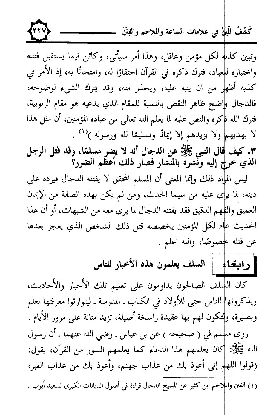كان السلف الصالحون يداومون على تعليم تلك الأخبار والأحاديث، ويذكرونها للناس حتى الأولاد فى الكتاب -والمدرسة- ليتوارثوا معرفتها بعلم وبصيرة، ولتكن لهم بها عقيدة راسخة أصلية، تزيد متانة على مرور الأيام.