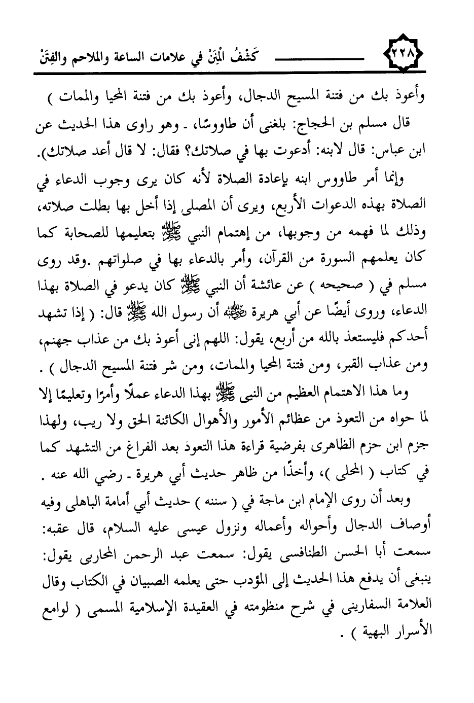 وبعد أن روى الإمام ابن ماجة في (سننه) حديث أبي أمامة الباهلي وفيه أوصاف الدجال وأحواله وأعماله ونزول عيسى عليه السلام، قال عقبه: سمعت أبا الحسن الطنافسي يقول: سمعت عبد الرحمن المحاربى يقول: ينبغي أن يدفع هذا الحديث إلى المؤدب حتى يعلمه الصبيان في الكتاب وقال العلامة السفارينى في شرح منظومته في العقيدة الإسلامية المسمى (لوامع الأسرار البهية).