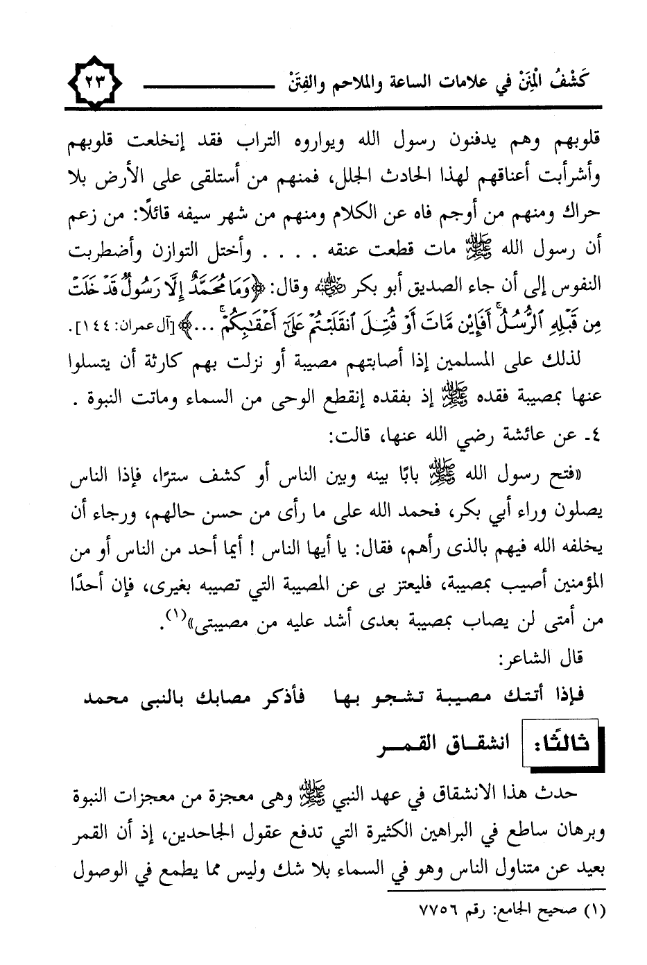 لذلك على المسلمين إذا أصابتهم مصيبة أو نزلت بهم كارثة أن يتسلوا عنها بمصيبة فقده -صلى اللَّه عليه وسلم- إذ بفقده إنقطع الوحى من السماء وماتت النبوة.