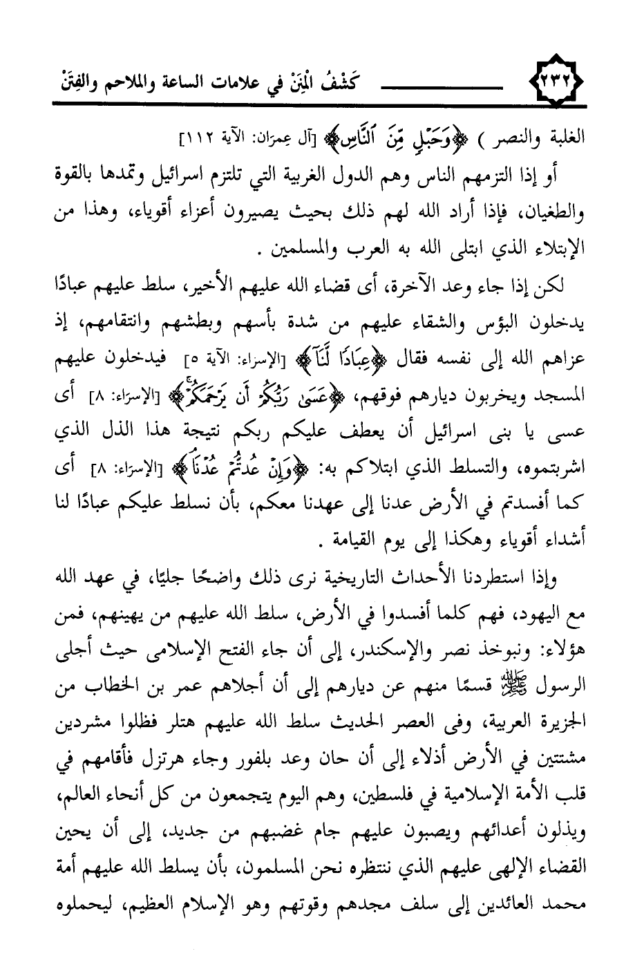 وإذا استطردنا الأحداث التاريخية نرى ذلك واضحًا جليًا، في عهد اللَّه مع اليهود، فهم كلما أفسدوا في الأرض، سلط اللَّه عليهم من يهينهم، فمن هؤلاء: ونبوخذ نصر والإسكندر، إلى أن جاء الفتح الإسلامى حيث أجلى الرسول -صلى اللَّه عليه وسلم- قسمًا منهم عن ديارهم إلى أن أجلاهم عمر بن الخطاب من الجزيرة العربية، وفى العصر الحديث سلط اللَّه عليهم هتلر فظلوا مشردين مشتتين في الأرض أذلاء إلى أن حان وعد بلفور وجاء هرتزل فأقامهم في قلب الأمة الإسلامية في فلسطين، وهم اليوم يتجمعون من كل أنحاء العالم، ويذلون أعدائهم ويصبون عليهم جام غضبهم من جديد، إلى أن يحين القضاء الإلهى عليهم الذي ننتظره نحن المسلمون، بأن يسلط اللَّه عليهم أمة محمد العائدين إلى سلف مجدهم وقوتهم وهو الإسلام العظيم، ليحملوه