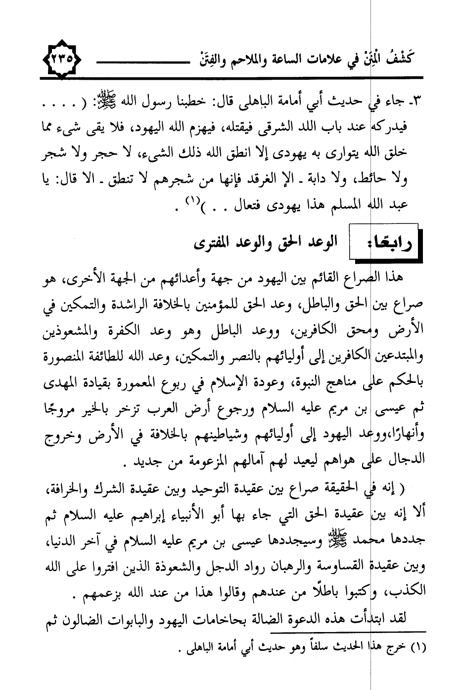 هذا الصراع القائم بين اليهود من جهة وأعدائهم من الجهة الأخرى، هو صراع بين الحق والباطل، وعد الحق للمؤمنين بالخلافة الراشدة والتمكين في الأرض ومحق الكافرين، ووعد الباطل وهو وعد الكفرة والمشعوذين والمبتدعين الكافرين إلى أوليائهم بالنصر والتمكين، وعد اللَّه للطائفة المنصورة بالحكم على مناهج النبوة، وعودة الإسلام في ربوع المعمورة بقيادة المهدى ثم عيسى بن مريم عليه السلام ورجوع أرض العرب تزخر بالخير مروجًا وأنهارًا، ووعد اليهود إلى أوليائهم وشياطينهم بالخلافة في الأرض وخروج الدجال على هواهم ليعيد لهم آمالهم المزعومة من جديد.