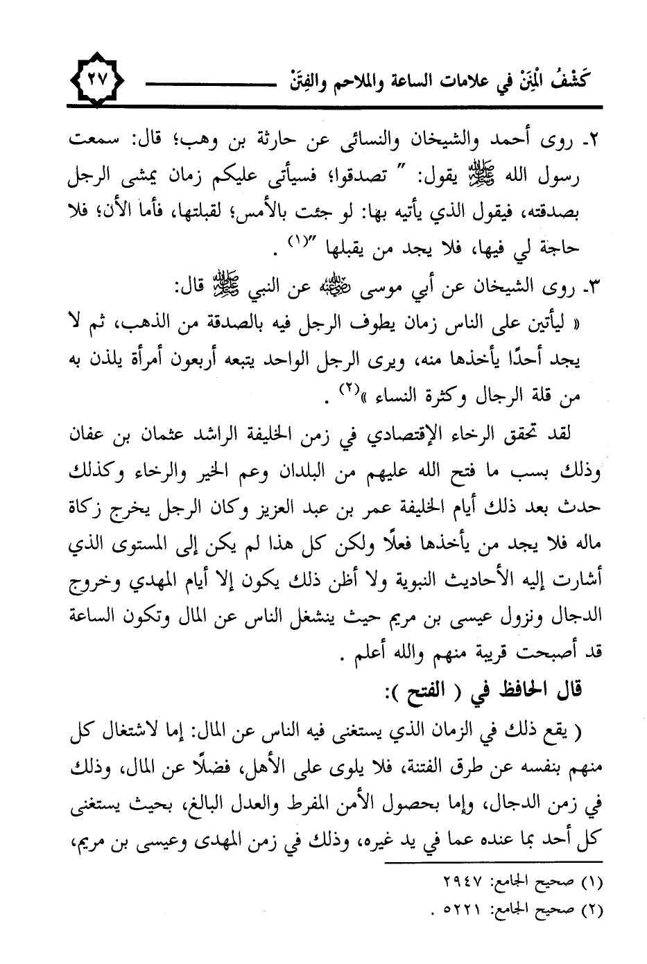 "ليأتين على الناس زمان يطوف الرجل فيه بالصدقة من الذهب، ثم لا يجد أحدًا يأخذها منه، ويرى الرجل الواحد يتبعه أربعون أمرأة يلذن به من قلة الرجال وكثرة النساء" (¬2).