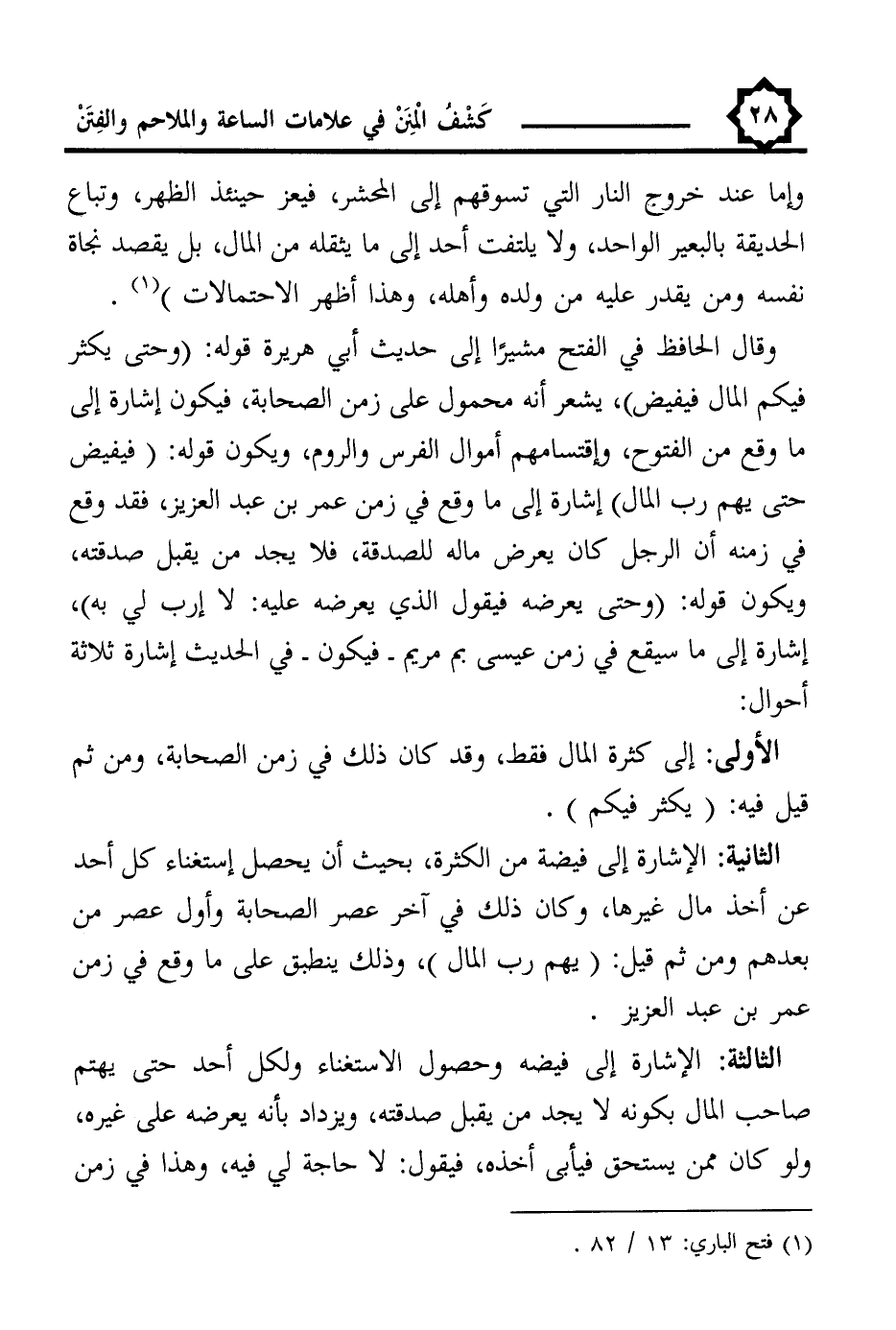وقال الحافظ في الفتح مشيرًا إلى حديث أبي هريرة قوله: (وحتى يكثر فيكم المال فيفيض)، يشعر أنه محمول على زمن الصحابة، فيكون إشارة إلى ما وقع من الفتوح، وإقتسامهم أموال الفرس والروم، ويكون قوله: (فيفيض حتى يهم رب المال) إشارة إلى ما وقع في زمن عمر بن عبد العزيز، فقد وقع في زمنه أن الرجل كان يعرض ماله للصدقة، فلا يجد من يقبل صدقته، ويكون قوله: (وحتى يعرضه فيقول الذي يعرضه عليه: لا إرب لي به)، إشارة إلى ما سيقع في زمن عيسى بم مريم -فيكون- في الحديث إشارة ثلاثة أحوال: