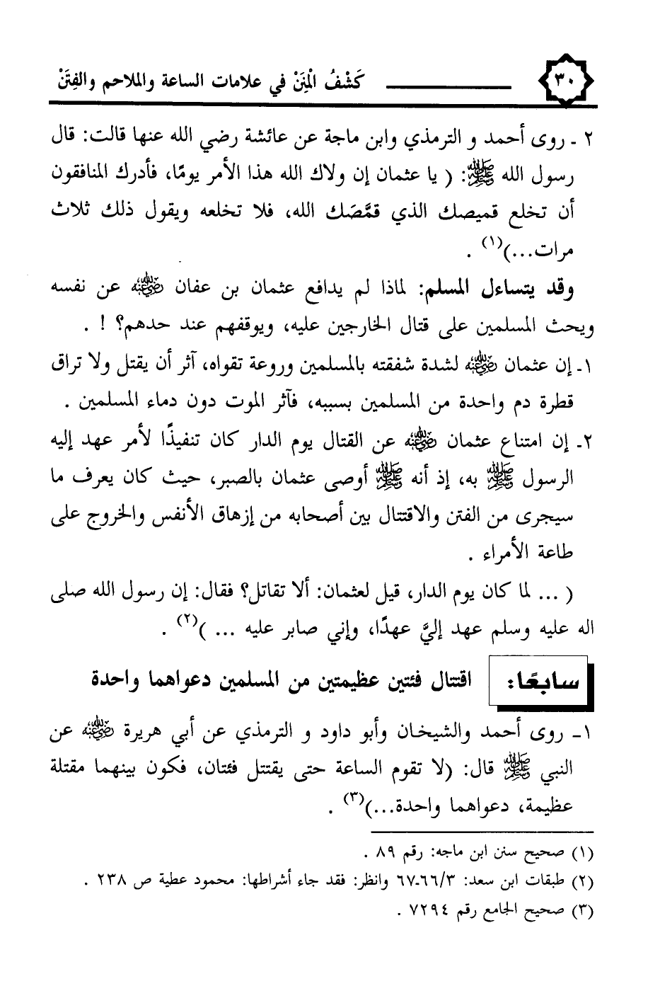 1 - روى أحمد والشيخان وأبو داود والترمذي عن أبي هريرة -رضي اللَّه عنه- عن النبي -صلى اللَّه عليه وسلم- قال: (لا تقوم الساعة حتى يقتتل فئتان، فكون بينهما مقتلة عظيمة، دعواهما واحدة. . .) (¬3).