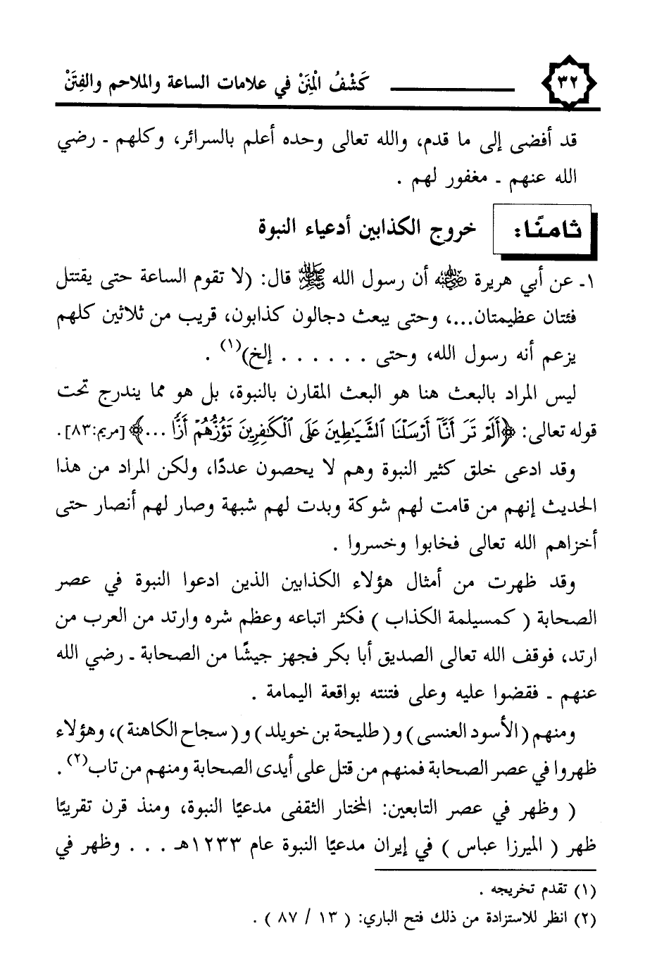 (وظهر في عصر التابعين: المختار الثقفى مدعيًا النبوة، ومنذ قرن تقريبًا ظهر (الميرزا عباس) في إيران مدعيًا النبوة عام 1233 هـ. . . وظهر في