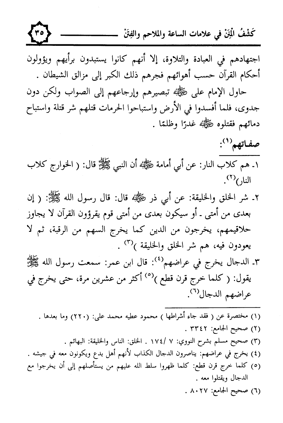 1 - هم كلاب النار: عن أبي أمامة -رضي اللَّه عنه- أن النبي -صلى اللَّه عليه وسلم- قال: (الخوارج كلاب النار) (¬2).