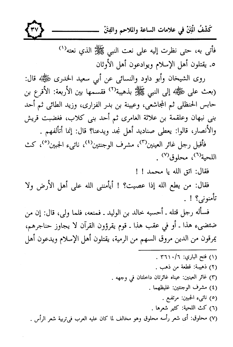فأقبل رجل غائر العينين (¬3)، مشرف الوجنتين (¬4)، ناتئ الجبين (¬5)، كث اللحية (¬6)، محلوق (¬7).