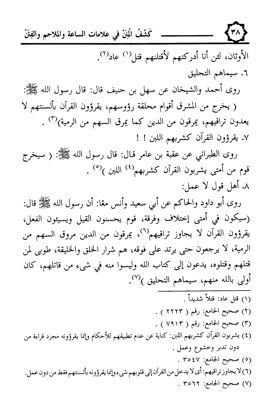 (¬4) يشربون القرآن كشربهم اللبن: كناية عن عدم تطبيقهم للأحكام وإنما يقرؤونه مجرد قراءة من دون تدبر وخشوع وعمل.