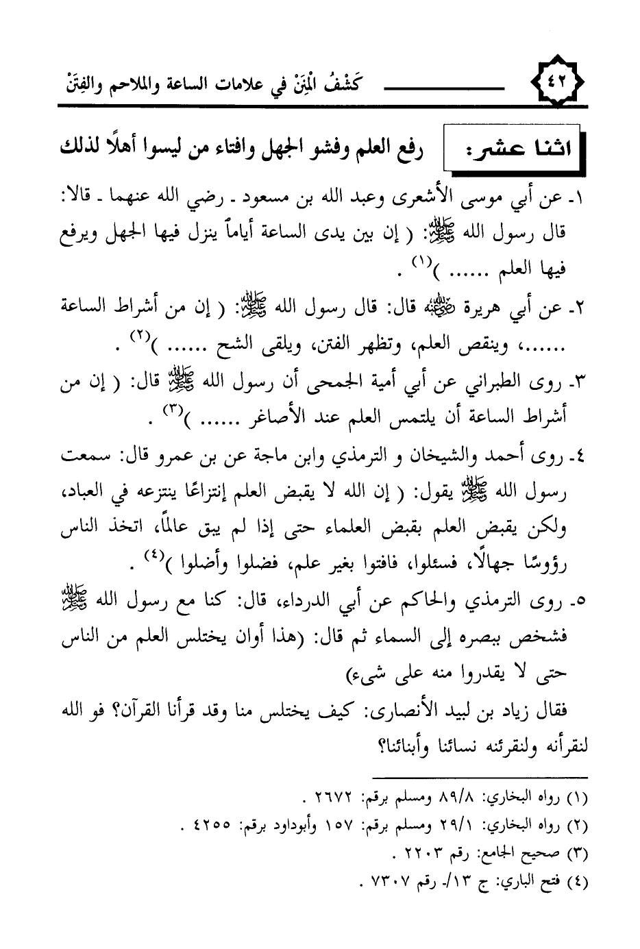 4 - روى أحمد والشيخان والترمذي وابن ماجة عن بن عمرو قال: سمعت رسول اللَّه -صلى اللَّه عليه وسلم- يقول: (إن اللَّه لا يقبض العلم إنتزاعًا ينتزعه في العباد، ولكن يقبض العلم بقبض العلماء حتى إذا لم يبق عالمًا، اتخذ الناس رؤوسًا جهالًا، فسئلوا، فافتوا بغير علم، فضلوا وأضلوا) (¬4).