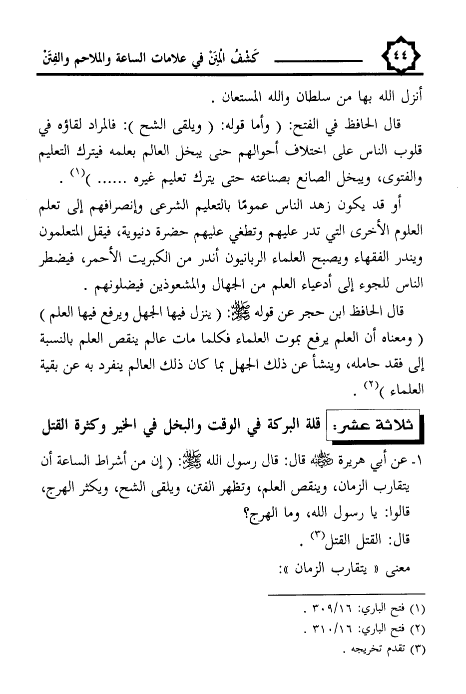 1 - عن أبي هريرة -رضي اللَّه عنه- قال: قال رسول اللَّه -صلى اللَّه عليه وسلم-: (إن من أشراط الساعة أن يتقارب الزمان، وينقص العلم، وتظهر الفتن، ويلقى الشح، ويكثر الهرج، قالوا: يا رسول اللَّه، وما الهرج؟