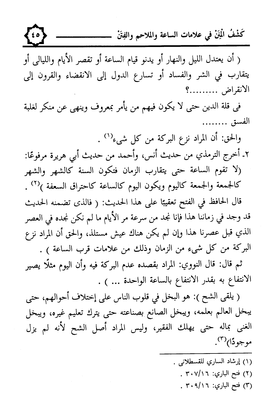 (أن يعتدل الليل والنهار أو يدنو قيام الساعة أو تقصر الأيام والليالى أو يتقارب في الشر والفساد أو تسارع الدول إلى الانقضاء والقرون إلى الانقراض. . .؟.