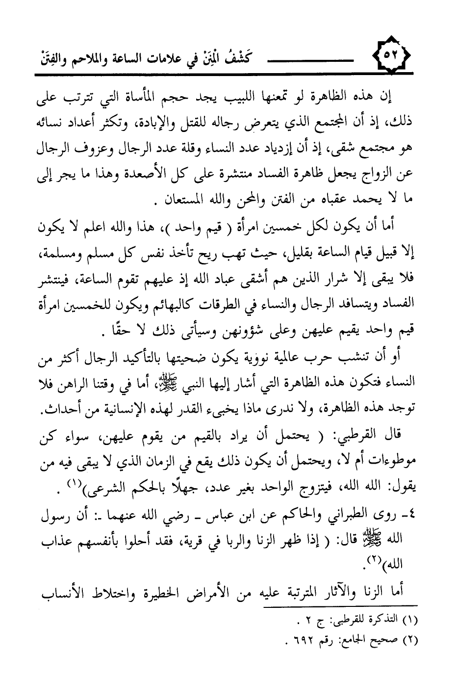 أو أن تنشب حرب عالمية نووية يكون ضحيتها بالتأكيد الرجال أكثر من النساء فتكون هذه الظاهرة التي أشار إليها النبي -صلى اللَّه عليه وسلم-، أما في وقتنا الراهن فلا توجد هذه الظاهرة، ولا ندرى ماذا يخبئ القدر لهذه الإنسانية من أحداث.