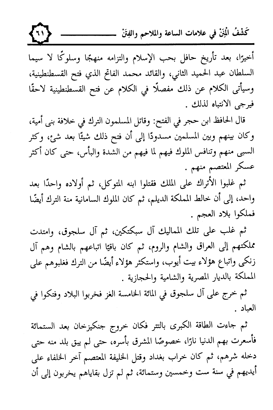 ثم جاءت الطامة الكبرى بالتتر فكان خروج جنكيزخان بعد الستمائة فأسعرت بهم الدنيا نارًا، خصوصًا المشرق بأسره، حتى لم يبق بلد منه حتى دخله شرهم، ثم كان خراب بغداد وقتل الخليفة المعتصم آخر الخلفاء على أيديهم في سنة ست وخمسين وستمائة، ثم لم تزل بقاياهم يخربون إلى أن