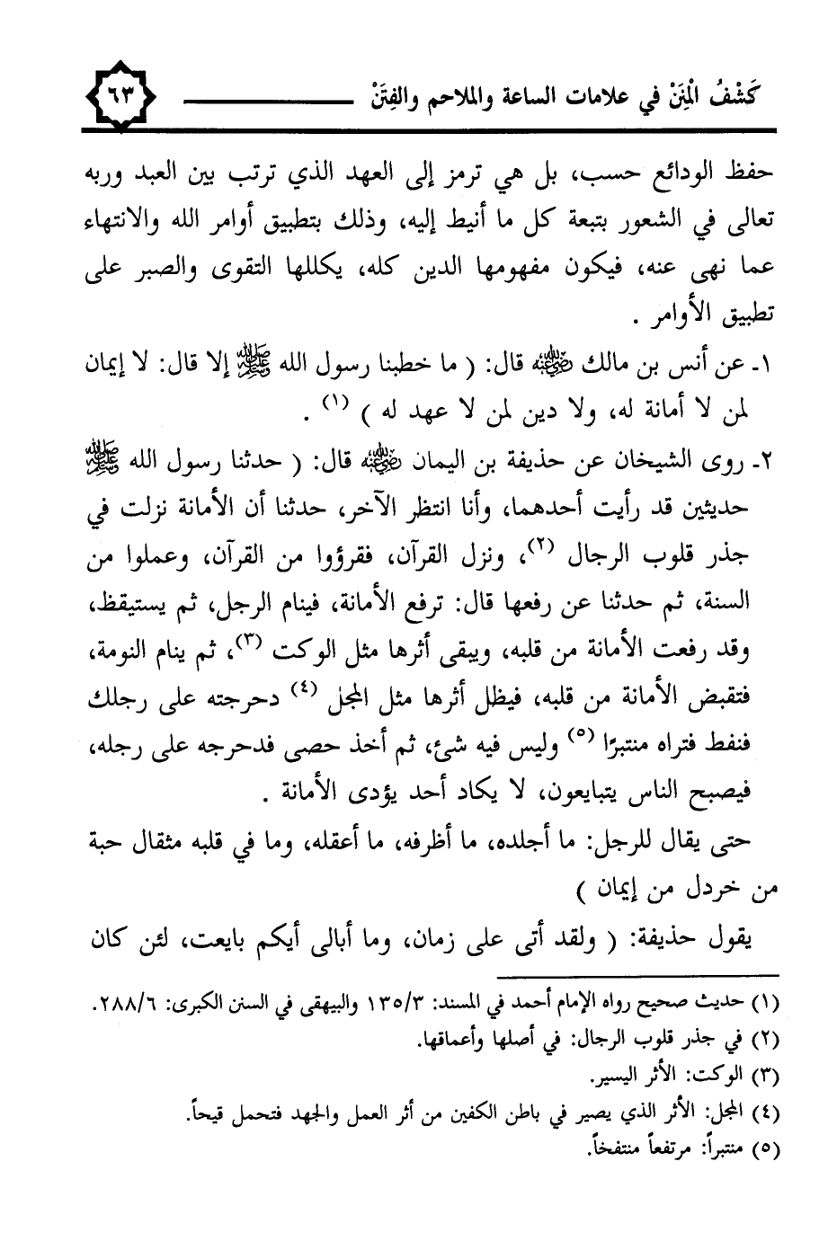 2 - روى الشيخان عن حذيفة بن اليمان -رضي اللَّه عنه- قال: (حدثنا رسول اللَّه -صلى اللَّه عليه وسلم- حديثين قد رأيت أحدهما، وأنا انتظر الآخر، حدثنا أن الأمانة نزلت في جذر قلوب الرجال (¬2)، ونزل القرآن، فقرؤوا من القرآن، وعملوا من السنة، ثم حدثنا عن رفعها قال: ترفع الأمانة، فينام الرجل، ثم يستيقظ، وقد رفعت الأمانة من قلبه، ويبقى أثرها مثل الوكت (¬3)، ثم ينام النومة، فتقبض الأمانة من قلبه، فيظل أثرها مثل المجل (¬4) دحرجته على رجلك فنفط فتراه منتبرًا (¬5) وليس فيه شيء، ثم أخذ حصى فدحرجه على رجله، فيصبح الناس يتبايعون، لا يكاد أحد يؤدى الأمانة.