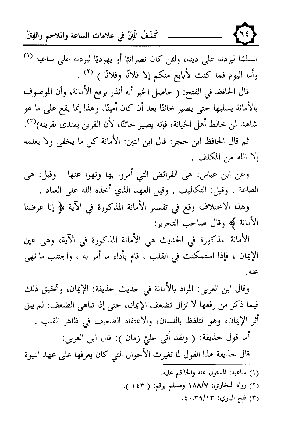 قال الحافظ في الفتح: (حاصل الخبر أنه أنذر برفع الأمانة، وأن الموصوف بالأمانة يسلبها حتى يصير خائنًا بعد أن كان أمينًا، وهذا إنما يقع على ما هو شاهد لمن خالط أهل الخيانة، فإنه يصير خائنًا؛ لأن القرين يقتدى بقرينه) (¬3).