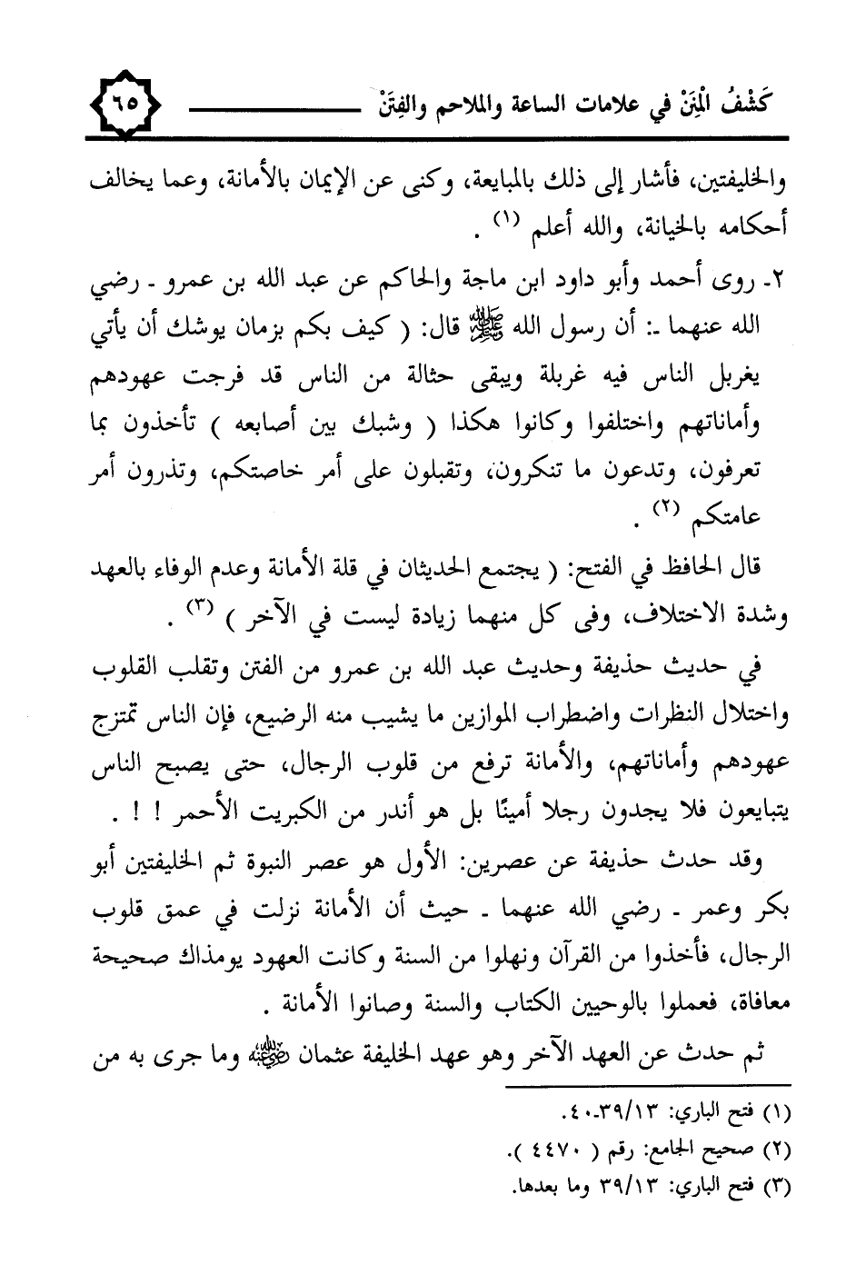 في حديث حذيفة وحديث عبد اللَّه بن عمرو من الفتن وتقلب القلوب واختلال النظرات واضطراب الموازين ما يشيب منه الرضيع، فإن الناس تمتزج عهودهم وأماناتهم، والأمانة ترفع من قلوب الرجال، حتى يصبح الناس يتبايعون فلا يجدون رجلًا أمينًا بل هو أندر من الكبريت الأحمر!!.