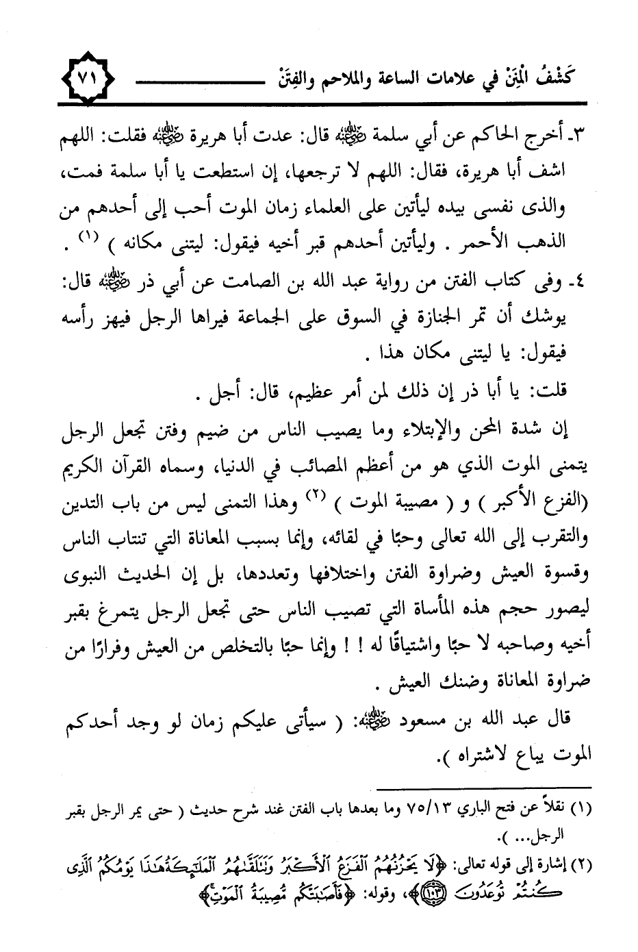(¬1) نقلًا عن فتح الباري 13/ 75 وما بعدها باب الفتن عند شرح حديث (حتى يمر الرجل بقبر الرجل. . .).