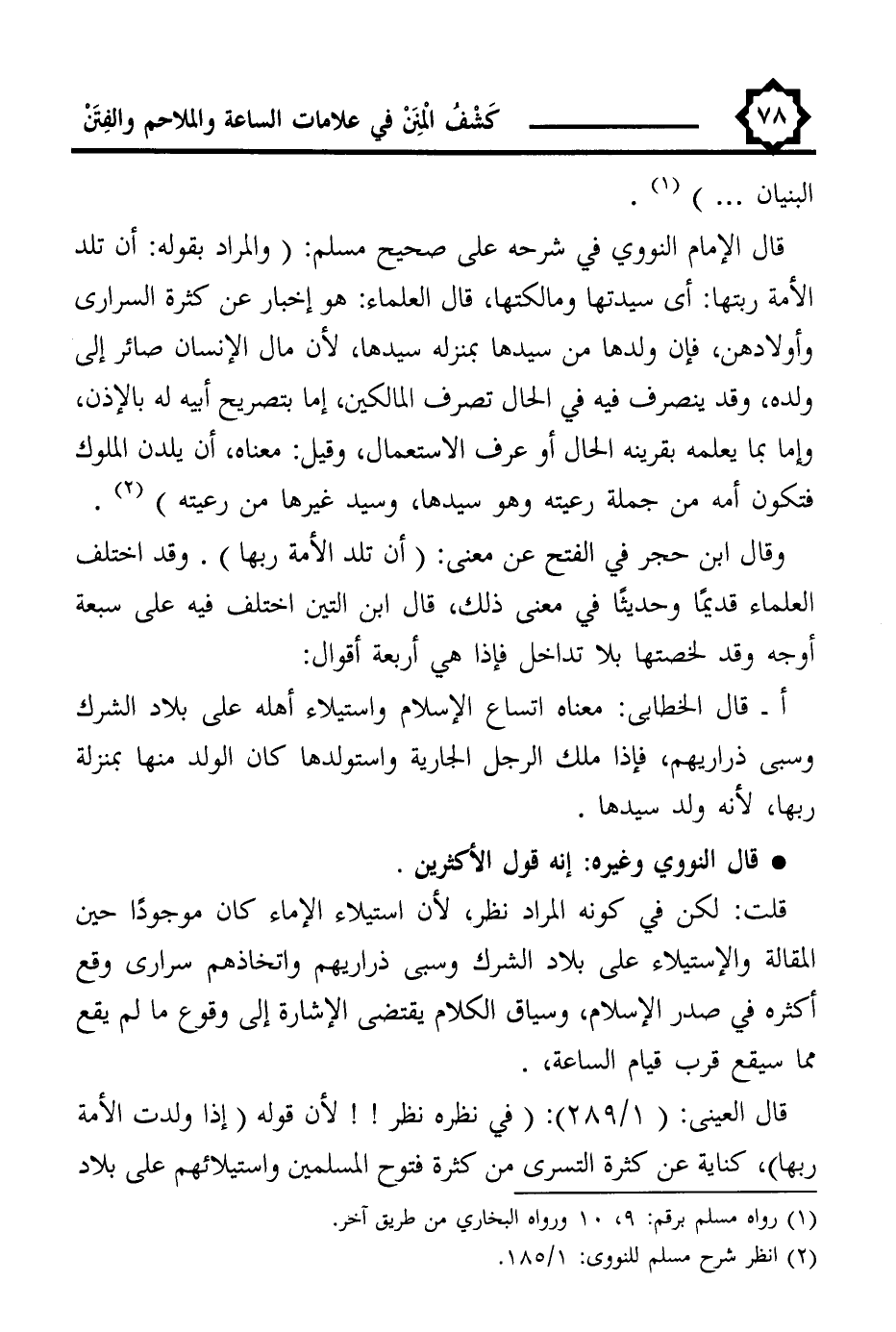 قال العيني: (1/ 289): (في نظره نظر!! لأن قوله (إذا ولدت الأمة ربها)، كناية عن كثرة التسرى من كثرة فتوح المسلمين واستيلائهم على بلاد