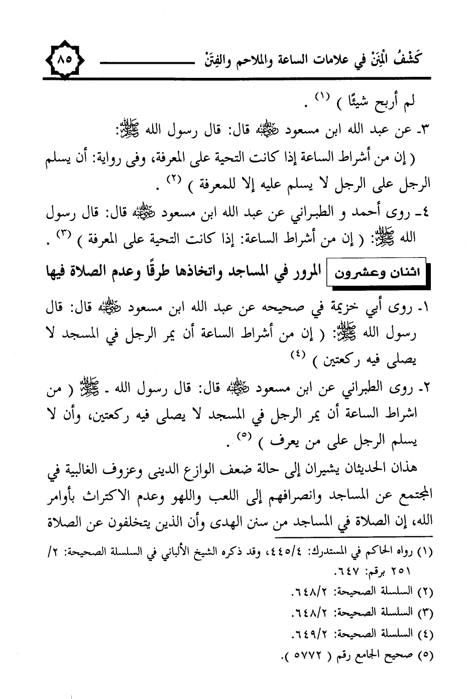 2 - روى الطبراني عن ابن مسعود -رضي اللَّه عنه- قال: قال رسول اللَّه -صلى اللَّه عليه وسلم- (من اشراط الساعة أن يمر الرجل في المسجد لا يصلى فيه ركعتين، وأن لا يسلم الرجل على من يعرف) (¬5).