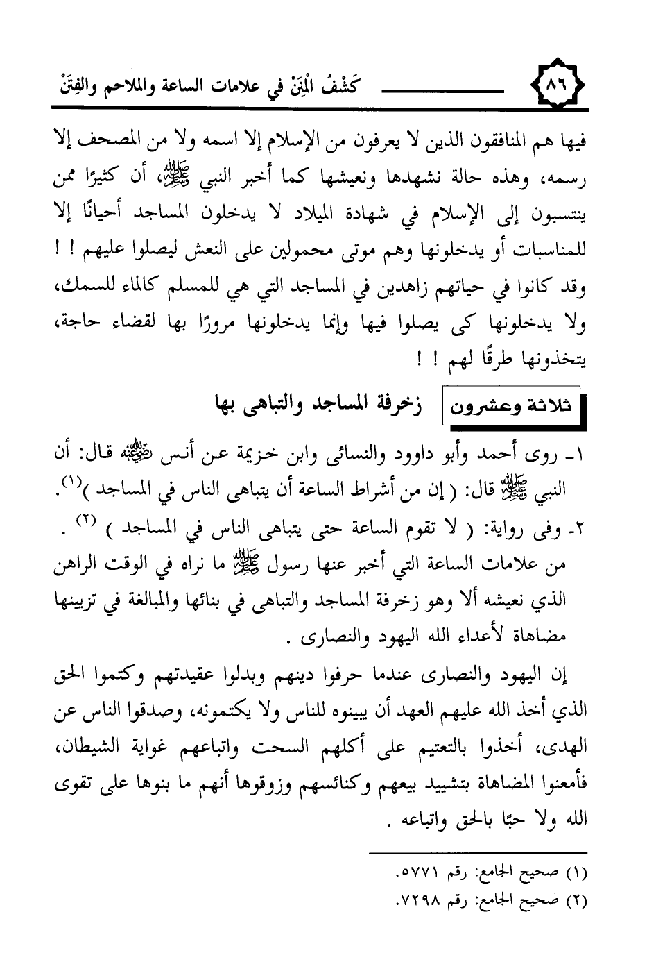 1 - روى أحمد وأبو داوود والنسائي وابن خزيمة عن أنس -رضي اللَّه عنه- قال: أن النبي -صلى اللَّه عليه وسلم- قال: (إن من أشراط الساعة أن يتباهى الناس في المساجد) (¬1).