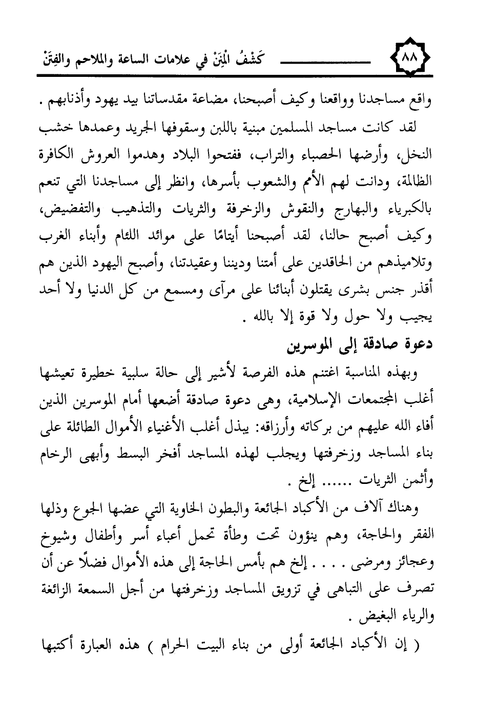 وهناك آلاف من الأكباد الجائعة والبطون الخاوية التي عضها الجوع وذلها الفقر والحاجة، وهم ينؤون تحت وطأة تحمل أعباء أسر وأطفال وشيوخ وعجائز ومرضى. . . إلخ هم بأمس الحاجة إلى هذه الأموال فضلًا عن أن تصرف على التباهى في تزويق المساجد وزخرفتها من أجل السمعة الزائغة والرياء البغيض.