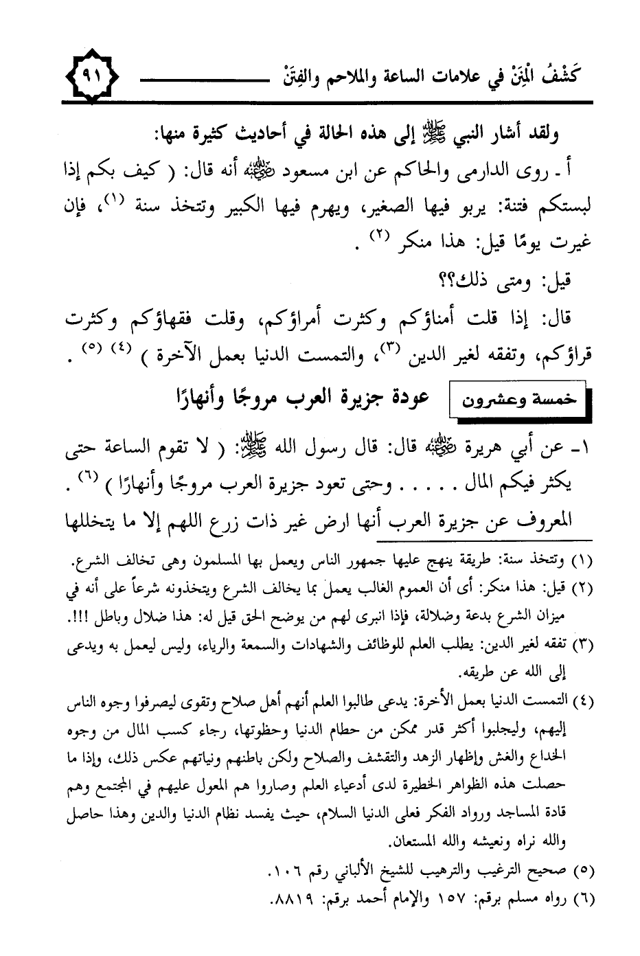 1 - عن أبي هريرة -رضي اللَّه عنه- قال: قال رسول اللَّه -صلى اللَّه عليه وسلم-: (لا تقوم الساعة حتى يكثر فيكم المال. . . وجتى تعود جزيرة العرب مروجًا وأنهارًا) (¬6).