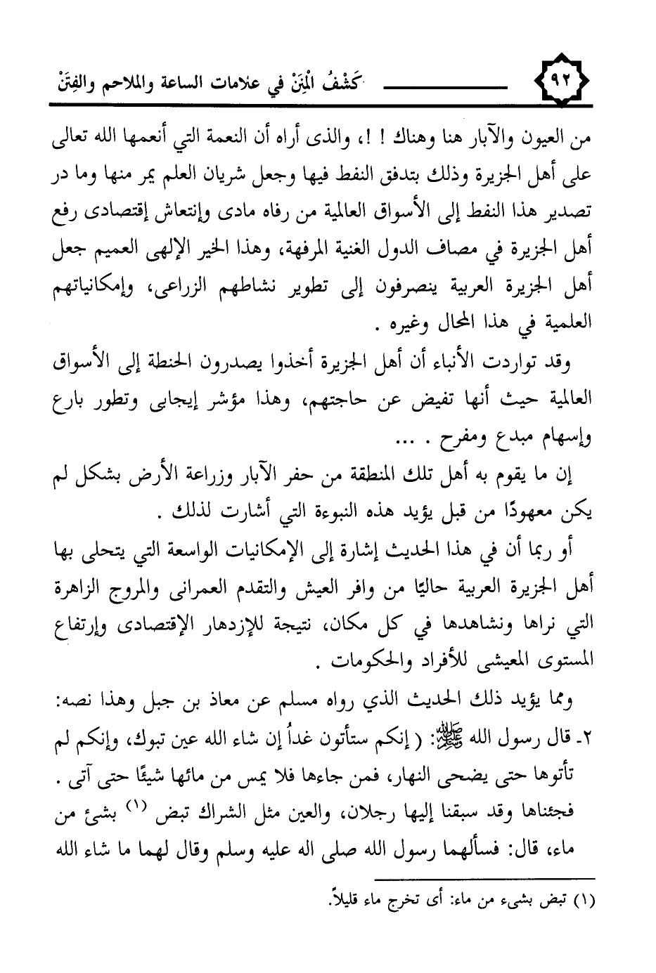 أو ربما أن في هذا الحديث إشارة إلى الإمكانيات الواسعة التي يتحلى بها أهل الجزيرة العربية حاليًا من وافر العيش والتقدم العمرانى والمروج الزاهرة التي نراها ونشاهدها في كل مكان، نتيجة للإزدهار الإقتصادى وإرتفاع المستوى المعيشى للأفراد والحكومات.
