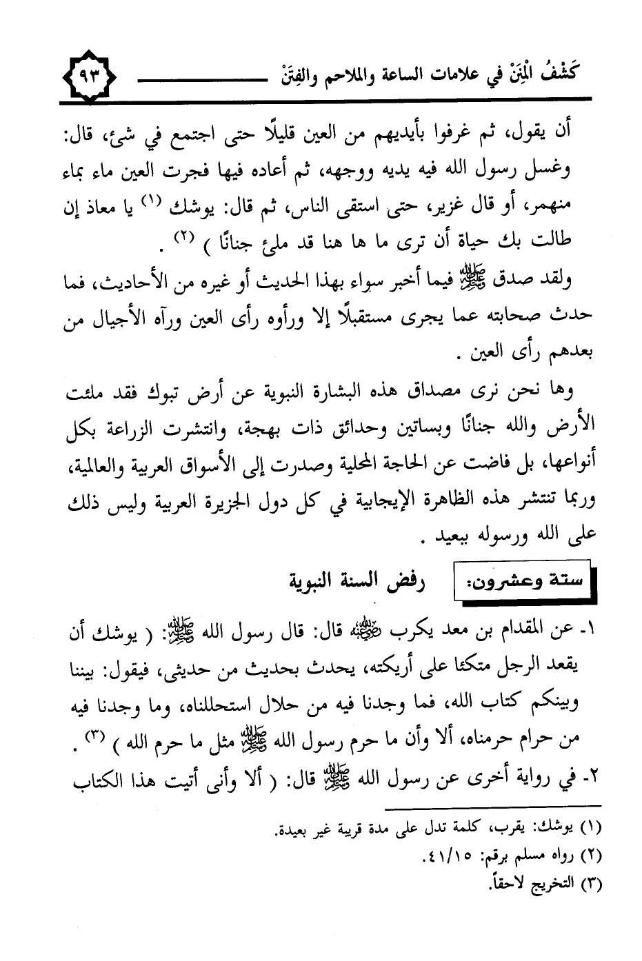 1 - عن المقدام بن معد يكرب -رضي اللَّه عنه- قال: قال رسول اللَّه -صلى اللَّه عليه وسلم -: (يوشك أن يقعد الرجل متكئا على أريكته، يحدث بحديث من حديثى، فيقول: بيننا وبينكم كتاب اللَّه، فما وجدنا فيه من حلال استحللناه، وما وجدنا فيه من حرام حرمناه، ألا وأن ما حرم رسول اللَّه -صلى اللَّه عليه وسلم- مثل ما حرم اللَّه) (¬3).