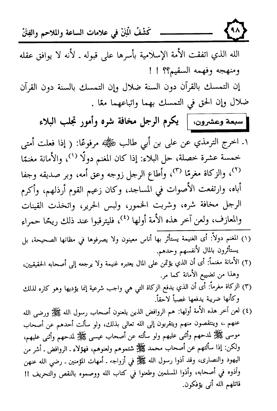 1 - اخرج الترمذي عن علي بن أبي طالب -رضي اللَّه عنه- مرفوعًا: (إذا فعلت أمتي خمسة عشرة خصلة، حل البلاء: إذا كان المغنم دولًا (¬1)، والأمانة مغنمًا (¬2)، والزكاة مغرمًا (¬3)، وأطاع الرجل زوجه وعق أمه، وبر صديقه وجفا أباه، وارتفعت الأصوات في المساجد، وكان زعيم القوم أرذلهم، وأكرم الرجل مخافة شره، وشربت الخمور، ولبس الحرير، واتخذت القينات والمعازف، ولعن آخر هذه الأمة أولها (¬4)، فليترقبوا عند ذلك ريحًا حمراء