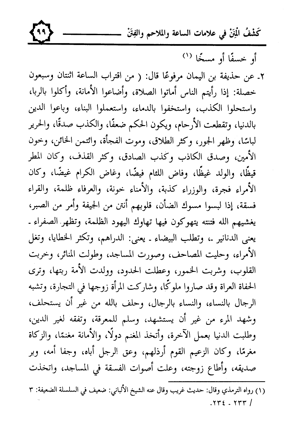 2 - عن حذيفة بن اليمان مرفوعًا قال: (من اقتراب الساعة اثنتان وسبعون خصلة: إذا رأيتم الناس أماتوا الصلاة، وأضاعوا الأمانة، وأكلوا بالربا، واستحلوا الكذب، واستخفوا بالدماء، واستعملوا البناء، وباعوا الدين بالدنيا، وتقطعت الأرحام، ويكون الحكم ضعفًا، والكذب صدقًا، والحرير لباسًا، وظهر الجور، وكثر الطلاق، وموت الفجأة، وائتمن الخائن، وخون الأمين، وصدق الكاذب وكذب الصادق، وكثر القذف، وكان المطر قيظًا، والولد غيظًا، وفاض اللئام فيضًا، وغاض الكرام غيضًا، وكان الأمراء فجرة، والوزراء كذبة، والأمناء خونة، والعرفاء ظلمة، والقراء فسقة، إذا لبسوا مسوك الضأن، قلوبهم أنتن من الجيفة وأمر من الصبر، يغشيهم اللَّه فتنته يتهوكون فيها تهاوك اليهود الظلمة، وتظهر، الصفراء -يعني الدنانير-، وتطلب البيضاء -يعنى: الدراهم، وتكثر الخطايا، وتغل الأمراء، وحليت المصاحف، وصورت المساجد، وطولت المنائر، وخربت القلوب، وشربت الخمور، وعطلت الحدود، وولدت الأمة ربتها، وترى الحفاة العراة وقد صاروا ملوكًا، وشاركت المرأة زوجها في التجارة، وتشبه الرجال بالنساء، والنساء بالرجال، وحلف باللَّه من غير أن يستحلف، وشهد المرء من غير أن يستشهد، وسلم للمعرفة، وتفقه لغير الدين، وطلبت الدنيا بعمل الآخرة، وأتخذ المغنم دولًا، والأمانة مغنمًا، والزكاة مغرمًا، وكان الزعيم القوم أرذلهم، وعق الرجل أباه، وجفا أمه، وبر صديقه، وأطاع زوجته، وعلت أصوات الفسقة في المساجد، واتخذت